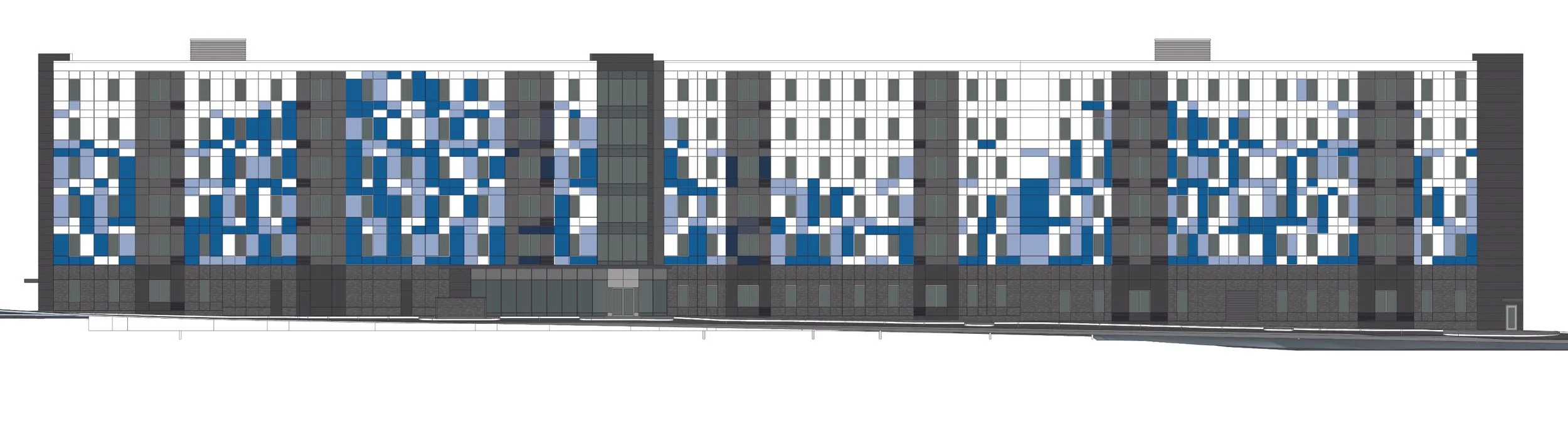 We had patterns, color, and symbols on the construction wraps, but how do we continue that into the building? Answer: the window filled stairwells.
